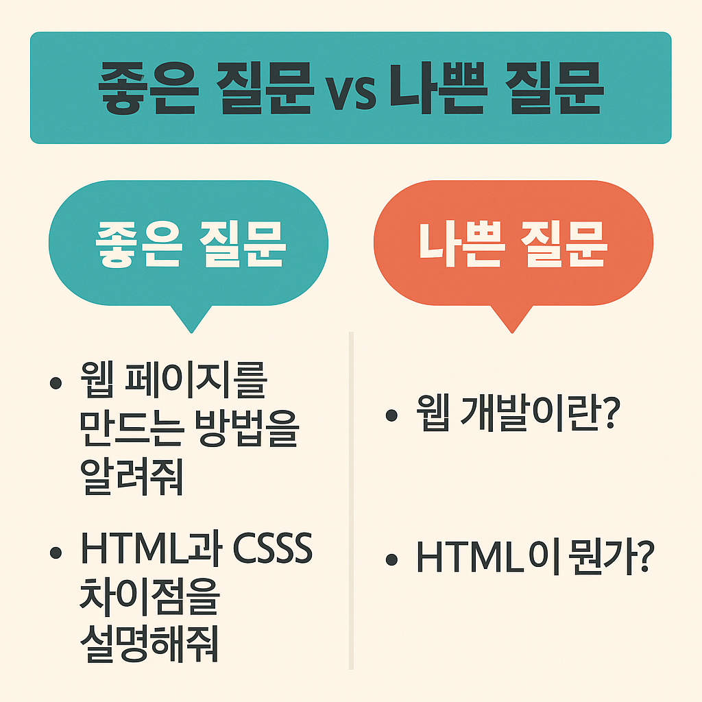 AI 툴을 사용할 때는 질문을 구체적으로 해야 원하는 결과를 얻을 수 있어요. 막연한 질문은 좋은 결과를 얻기 어렵고, 원하는 기능을 만들려면 어느 정도 코딩 개념을 알고 있어야 AI에게 더 나은 질문을 할 수 있습니다.