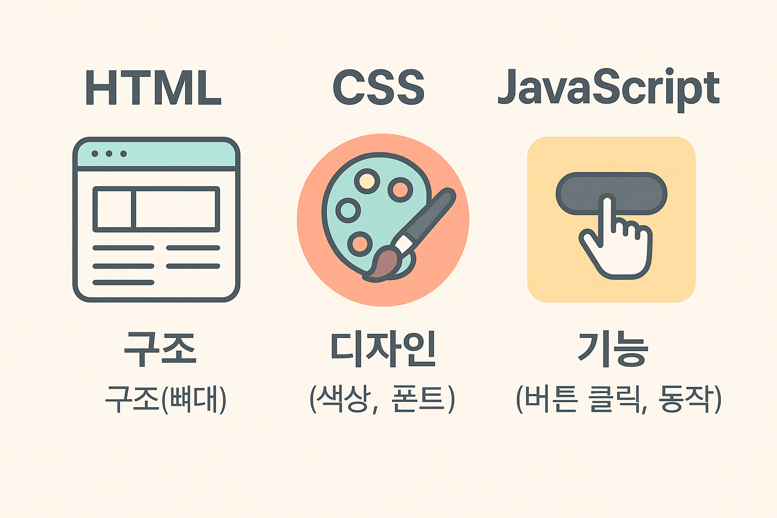 HTML, CSS, 자바스크립트: 웹사이트의 뼈대, 꾸미기, 기능