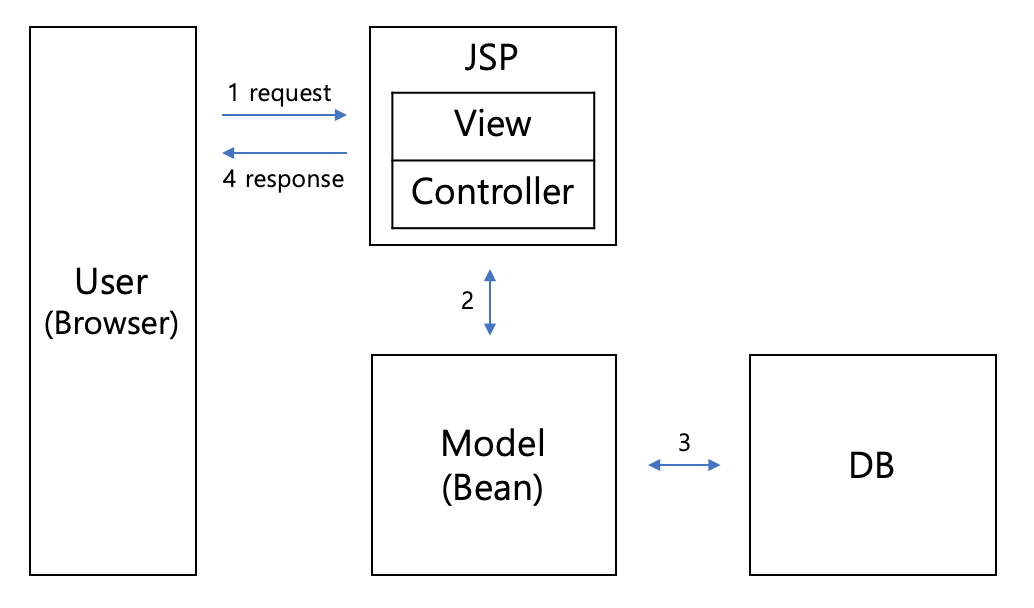 하나의 서블릿(Servlet)과 JSP 페이지 사용: 클라이언트의 요청이 하나의 서블릿에서 처리되며, 이 서블릿은 비즈니스 로직과 프레젠테이션 로직을 함께 처리합니다. JSP 페이지는 HTML 코드와 Java 코드를 함께 가지며, 클라이언트에게 전송됩니다.
