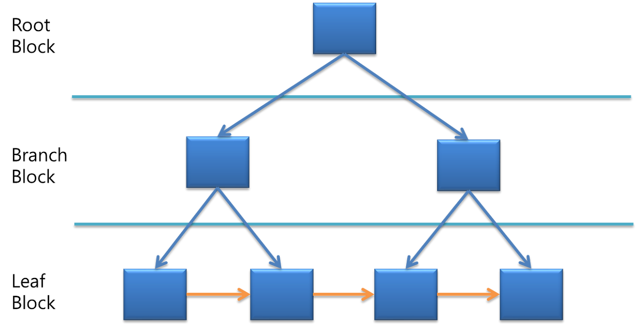 Leaf 블록에는 주황색 선이 있어 가로로 검색이 가능하므로 루트부터 매번 검색할 필요가 없어지면서 인덱스가 존재할 때의 속도가 상당히 향상됩니다.
