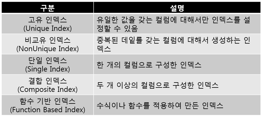 함수 기반 인덱스 (Function-Based Index):열에 함수나 식의 계산값을 적용하여 생성된 인덱스