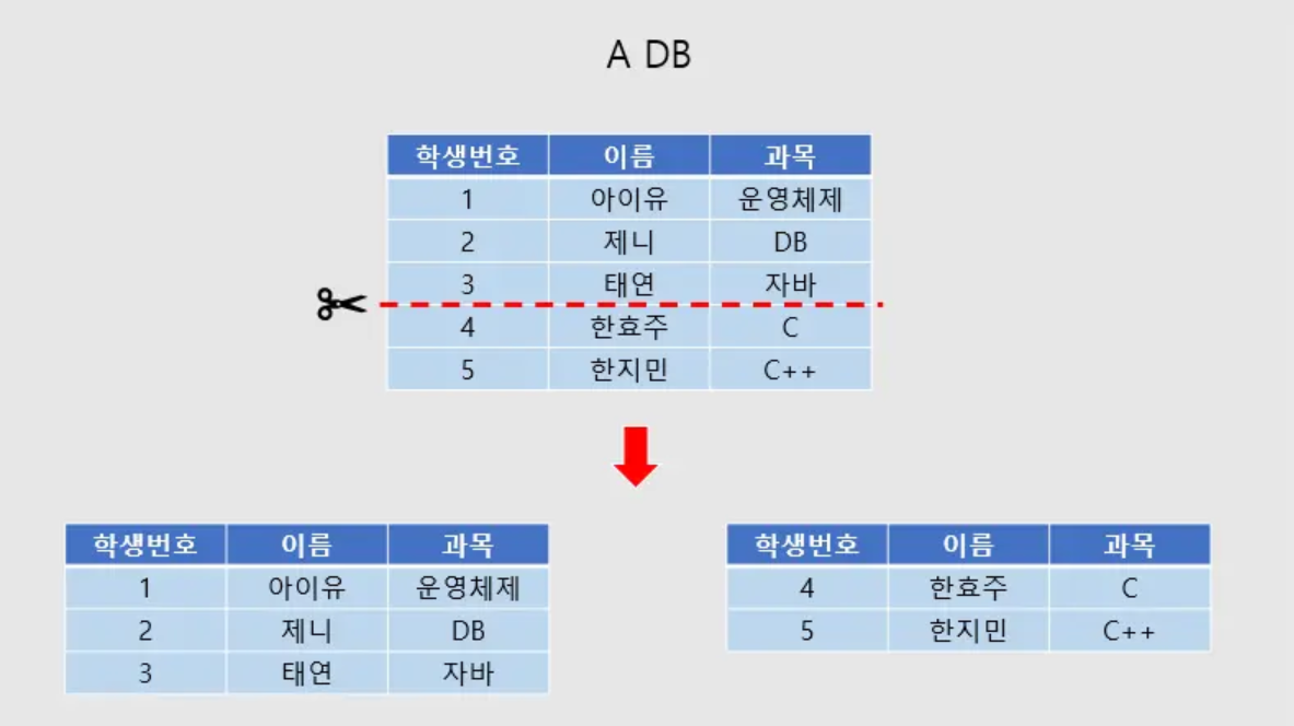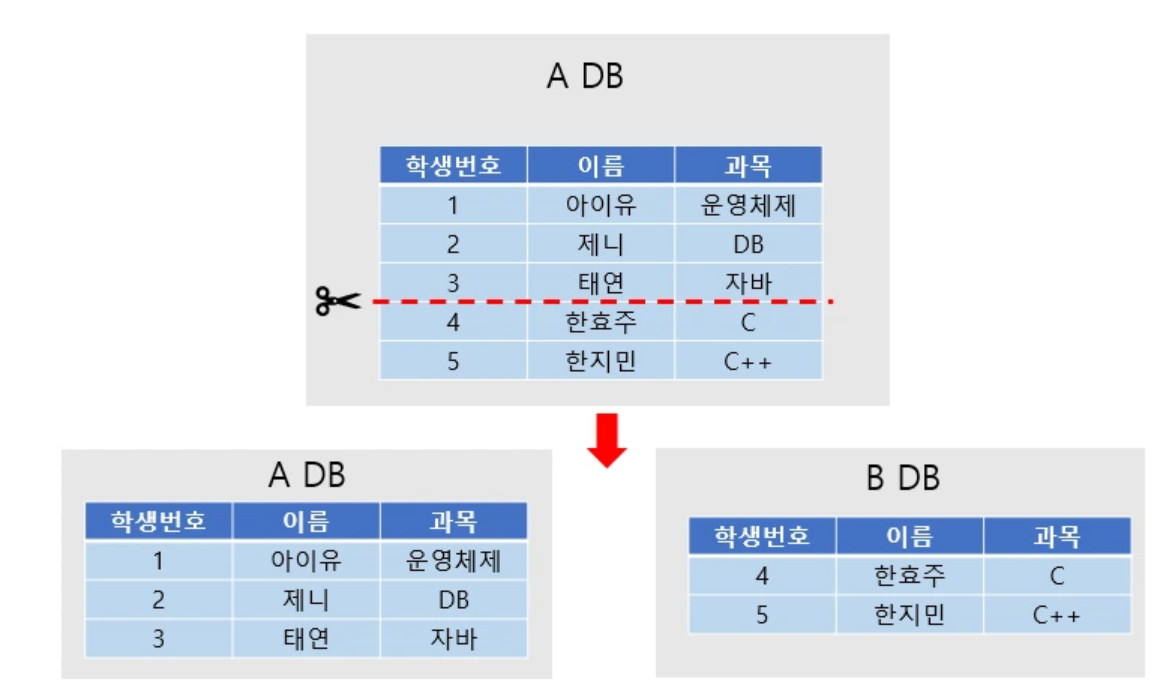 수평 샤딩은 데이터를 행 단위로 분할하는 방식입니다. 각 샤드는 동일한 테이블 스키마를 가지고 있지만 서로 다른 데이터 범위를 담당합니다. 주로 데이터의 균등한 분산과 확장성을 강조합니다.