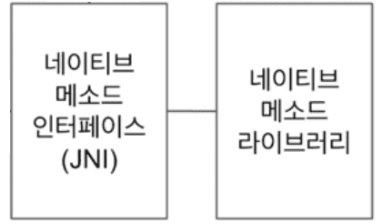 JVM은 JNI를 통해 호출되는 네이티브 메서드가 구현된 라이브러리와 네이티브 메서드 인터페이스를 포함합니다.