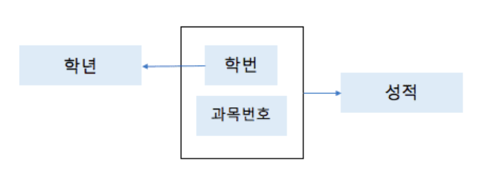 - X의 값을 알면 Y의 값을 바로 식별할 수 있고, X의 값에 Y의 값이 달라질 때, Y는 X에 함수적 종속이라고 함.