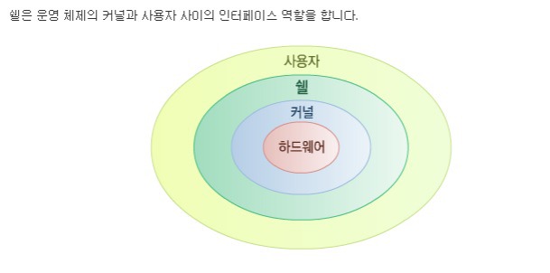 | 쉘 (Shell) | - 명령어 해석기 - 사용자의 명령어를 인식하여 프로그램을 호출하고 명령을 수행하는 명령어 해석기 |